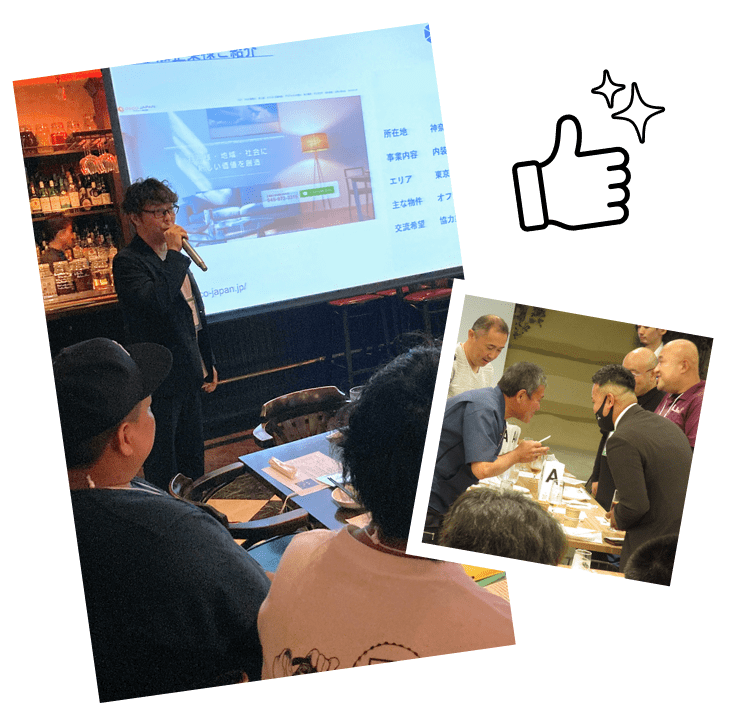 現場・工事請負を目的とした交流会のため、原則として建設会社様以外(人工出し、人材派遣・紹介、営業代行、経営コンサルタント、ホームページ制作、SNS運用、金融サービス、DXコンサルタント、情報商材等)の参加はできません。